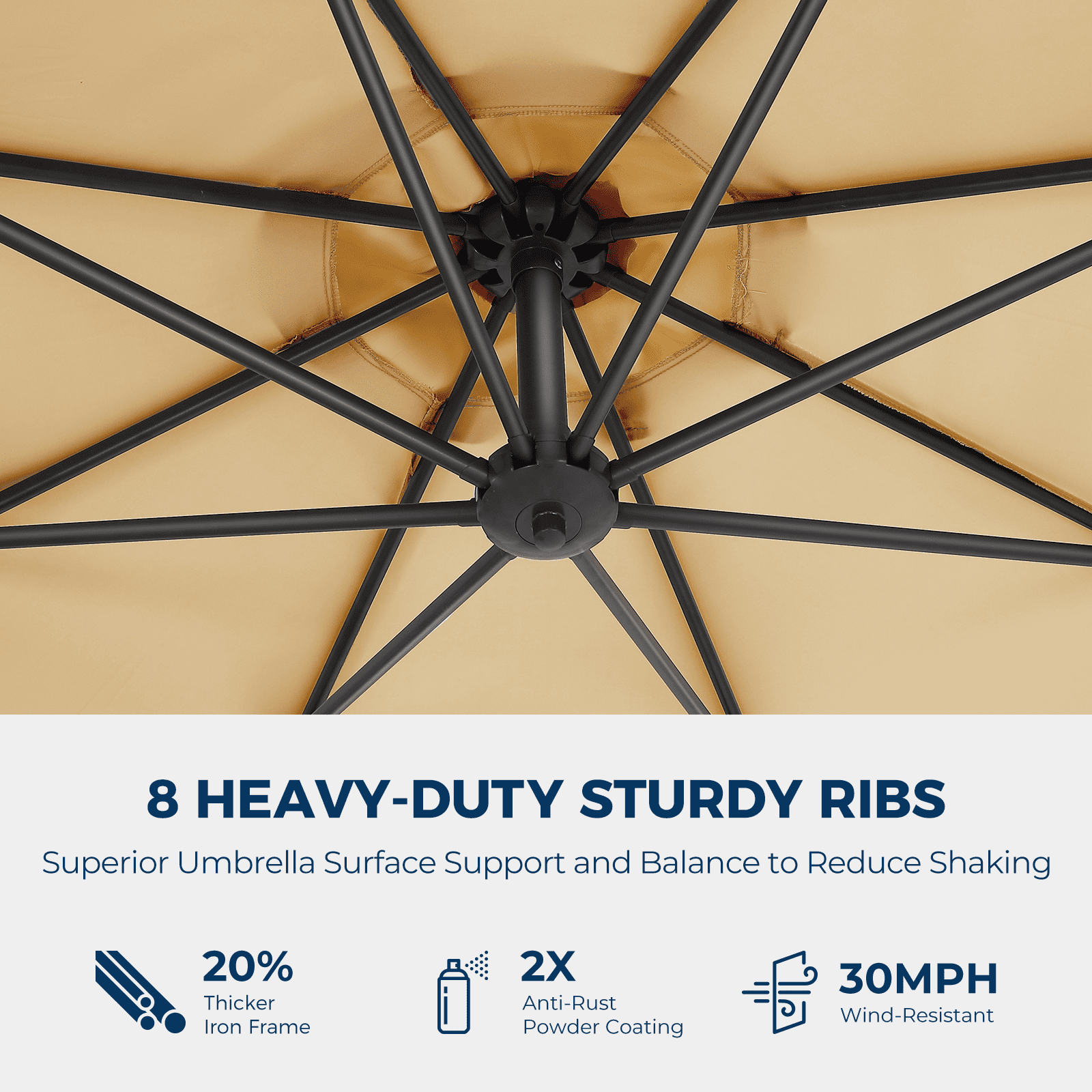 All-Round Sunshade:360°rotation function with round single design,combined with 100% polyester cloth, improves sun protection,can flexibly respond to sunlight from different directions,achieves sunshade without dead angles,and creates a cool and comfortable zone for you at any time. Super Stability:The iron pole has a wide diameter, plus 8 iron ribs for strong support,to build a stable structure,even if the wind is raging,it can be as stable as a rock, ensuring safety in use. Convenient Storage:Velcro strap design,can be quickly tied after folding the umbrella,neat and tidy, does not take up too much space,convenient for you to move or store at any time,easily solve the storage problem. Easy Control:The design with a crank makes the operation simple and smooth,one-handed opening and closing,angle adjustment,quick adaptation to light changes,enjoy a pleasant outdoor time. Beautiful and Durable:The surface is brown and two-color frosted sprayed,with cross tiles,not only the appearance is stylish and elegant,but also has excellent rust resistance,extends the service life,and highlights the quality.