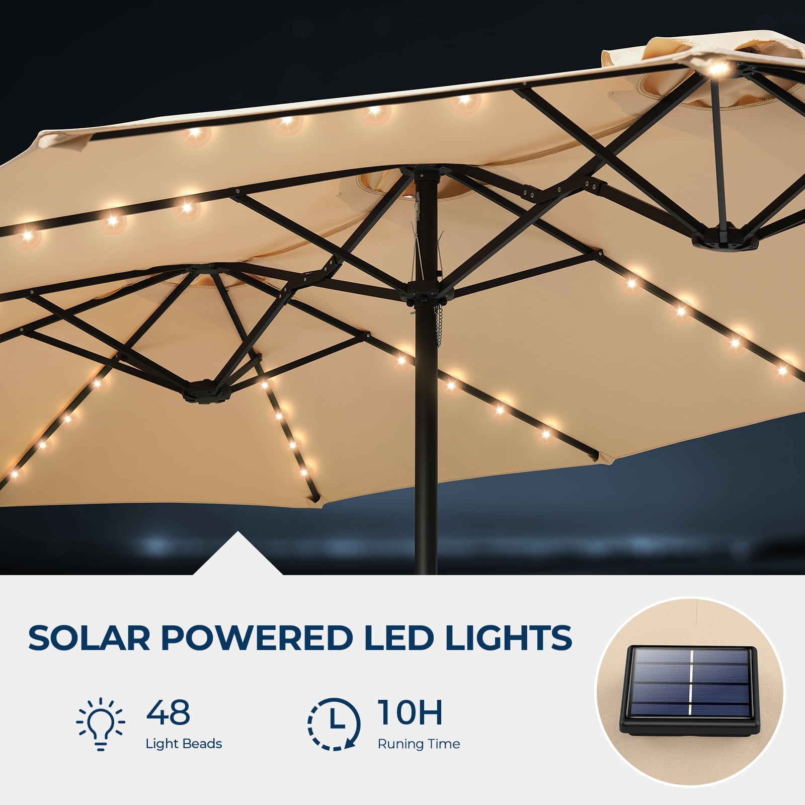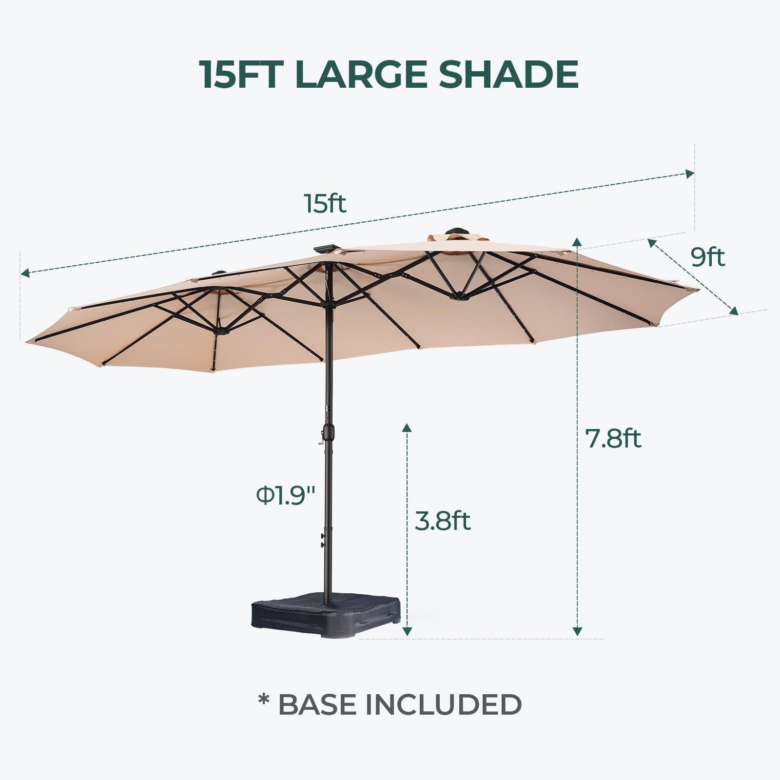 Ultra-Wide Patio Umbrella:The unique double-head 15ft large-size design is like a giant canopy that can easily cover any outdoor barbecue party,picnic with friends,or open-air rest area in commercial places,so that everyone can comfortably hide under this coolness. Sturdy and Durable:The entire umbrella frame is carefully made of all-iron material and has been professionally sprayed with plastic.It not only puts on a layer of solid protective armor for the umbrella frame to effectively resist wind and rain erosion,but also makes it have a strong load-bearing capacity,and its service life far exceeds that of ordinary umbrellas. Convenient Control:The bearing handle is equipped with an exquisite design,so that you can accurately adjust it to your favorite angle by holding the handle with one hand,and enjoy a convenient outdoor life. Stable and Portable:This double-headed terrace umbrella has a base,which is easy to install and firmly supports the giant umbrella;and when you need to move or store it,it can be quickly disassembled, which is light and easy to carry. Bright Night Light:48 high-brightness lamp beads are evenly distributed,so you can enjoy the joy of the party. During the day,they quietly accumulate solar energy,and when night falls,they will sparkle. They do not require additional power supply,are energy-saving and environmentally friendly,and are a highlight in outdoor scenes.
