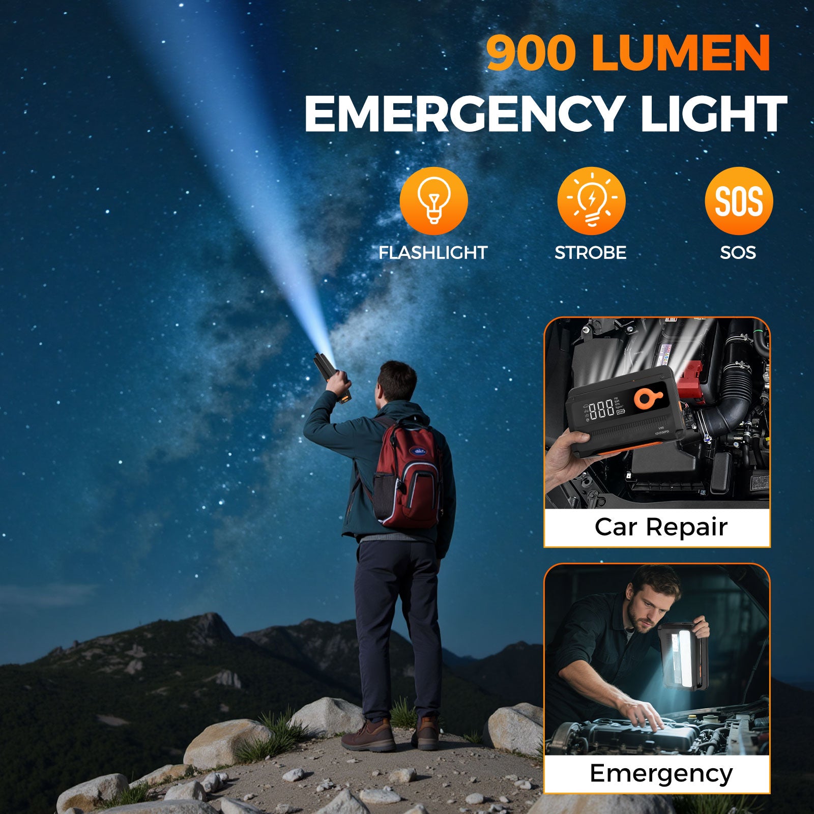 🔦【900 Lumens Flashlight】There are three modes of strong light/strobe/SOS, which can be switched with one button--it can cope with night car repairs, outdoor adventures, and emergency rescue! High brightness and long-range shooting, clearly visible in dark environments, flashing warnings in critical moments, safety protection is upgraded, and travel is safer!