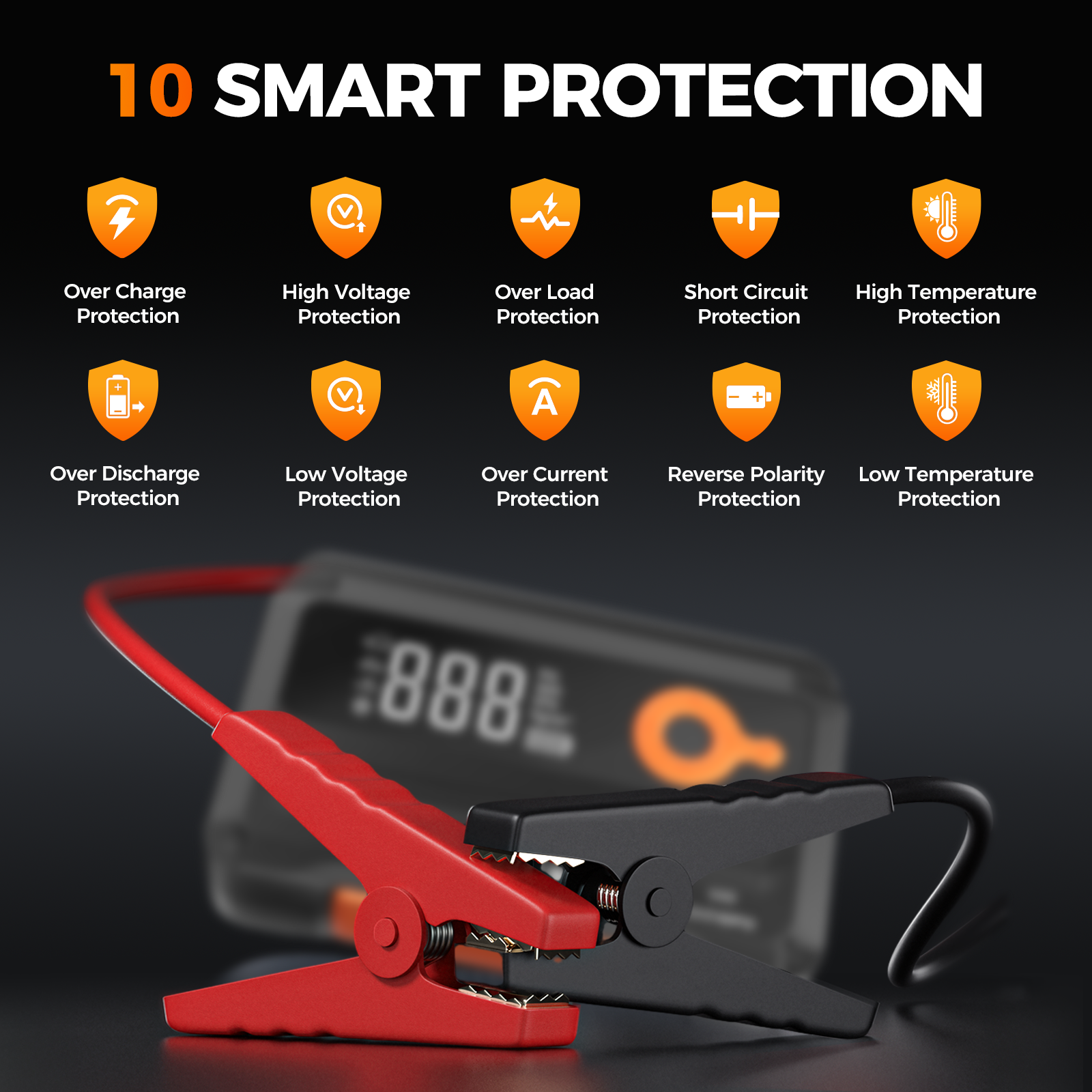 🛡️【10-Layer Safety Protection】 The intelligent jumper clip design has 10 layers of protection such as anti-reverse connection, anti-overcurrent, anti-short circuit, anti-overvoltage, and anti-overcharging. It reminds you of wrong operations in real time, and novices can also use it safely.