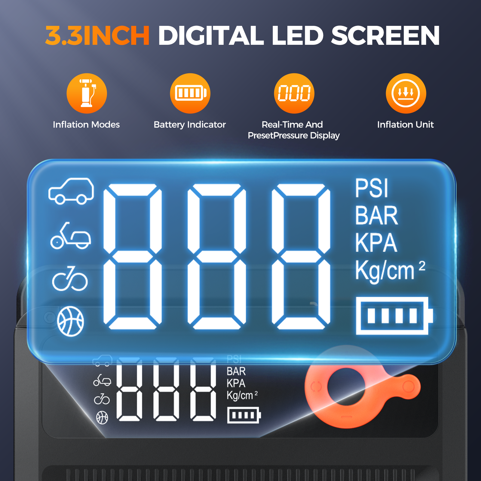 🚛【150 PSI Air Compressor】 This starter has a built-in 40-cylinder high-pressure air pump, which can quickly fill car tires, bicycles, balls, inflatable mattresses, etc., and can be inflated at any time for camping, self-driving, and sports equipment. Accurate tire pressure monitoring, stop when charging, safe and worry-free, outdoor emergency is more efficient!