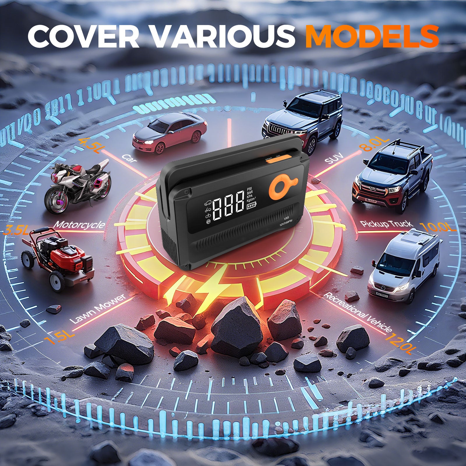 This multi-functional jump starter is designed for a variety of vehicles. It can quickly start all gas and diesel below 12L. It is suitable for 12V vehicles such as cars, trucks, motorcycles, boats, RVs, tractors, ATVs, UTVs, lawn mowers, etc. It not only provides strong starting current, but also has a built-in 150 PSI air compressor, which can easily inflate tires, sports equipment or inflatable toys.