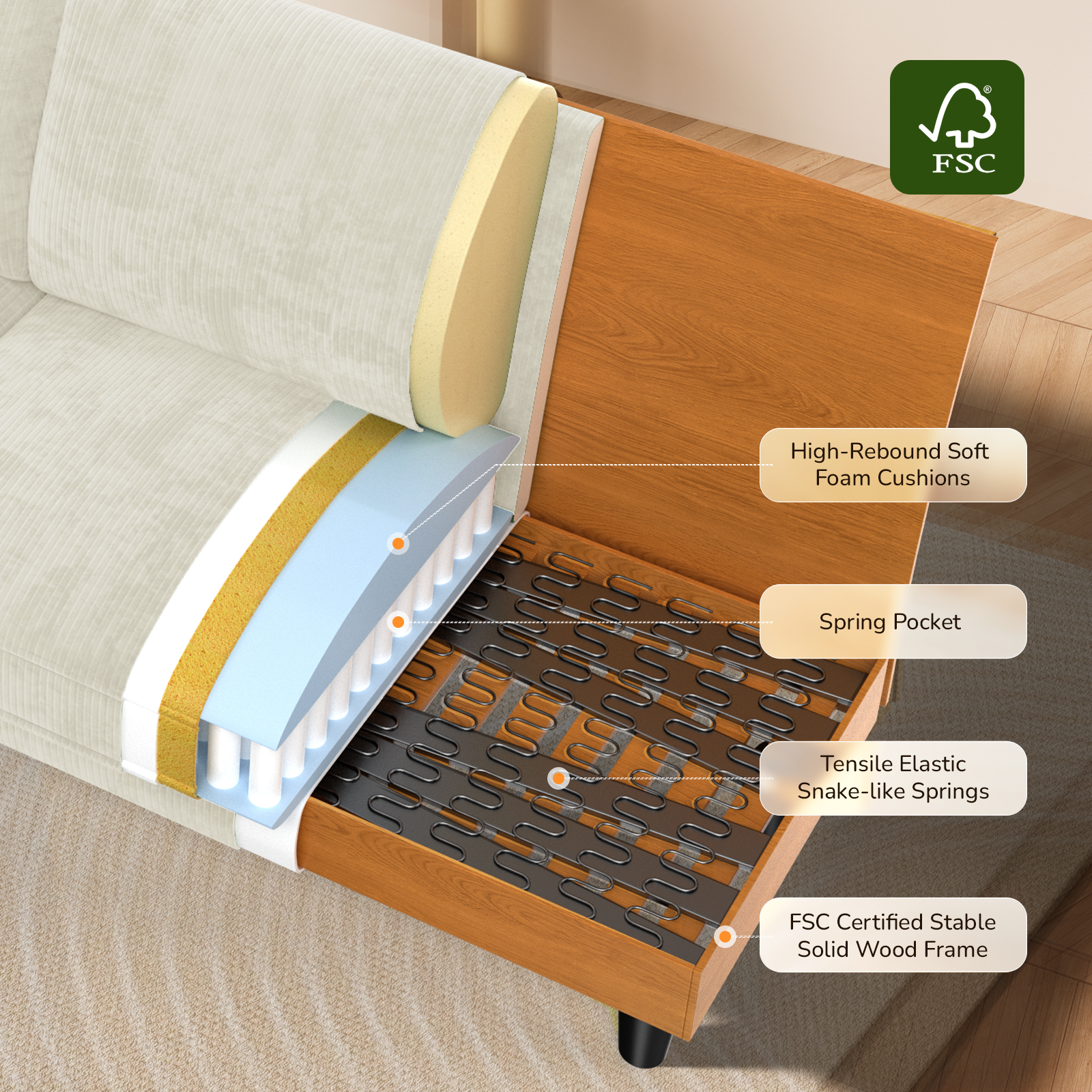 Solid wood certified frame, stable structure, durable. 850LB super strong load-bearing capacity, no collapse even after sitting for a long time.