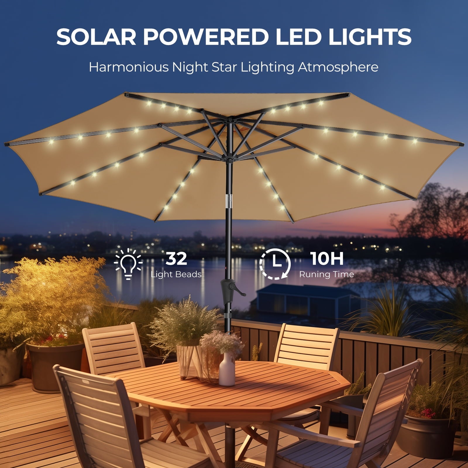9ft Solar Polyester 32 LED Lighted Patio Umbrella with Tilt Adjustment and UV-Resistant Fabric,for Garden,Deck,Backyard,Pool and Beach