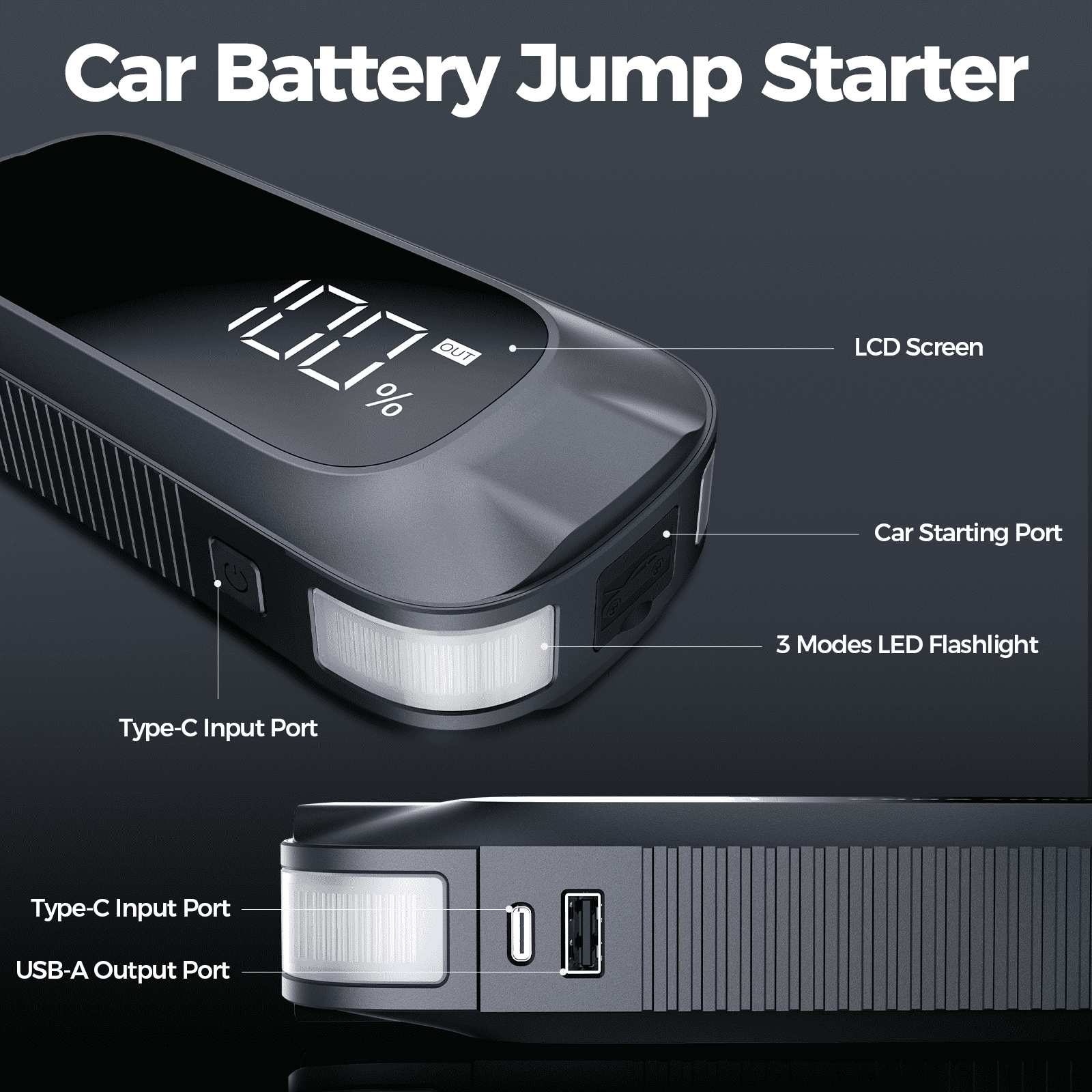 INTELLIGENT PROTECTION - With intelligent protection systems such as short circuit, low battery, high temperature and reverse connection. The jumper clamp is designed to be sturdy and durable, and the cable of sufficient length is more convenient to use. The jumper box has a prompt indicator and a buzzer to indicate correct operation. MULTI-FUNCTIONAL LED LIGHT - This car battery jump starter features three working modes of built-in light (flashlight/SOS/strobe), which can be used as an emergency tool. Super bright LED lights provide more convenience for night use. This multi-functional flashlight is perfect for camping, outdoor, emergency, travel, etc. WHAT YOU GET - 1 X Portable Battery Starter, 1 X Jumper Cables, 1 X USB-C Cable, 1 X Cigarette Lighter Converter, 1 X Carry Case, 1 X User Manual, and professional 24-hour online after-sales team for any issue. Tips: No adapter included (All your cell phone USB type charger could be used to charge the jump starter.). POWERFUL & LARGE CAPACITY - AVAPOW car jump starter provides up to 4000 peak current, 27800mAh capacity can start all 12V cars (Including hybrid power), motorcycles, ATV, UTV, lawn mowers, snowmobiles, etc. easily in just a few minutes. (for All Gas or Up to 10L Diesel) - up to 40 times on a full charge.