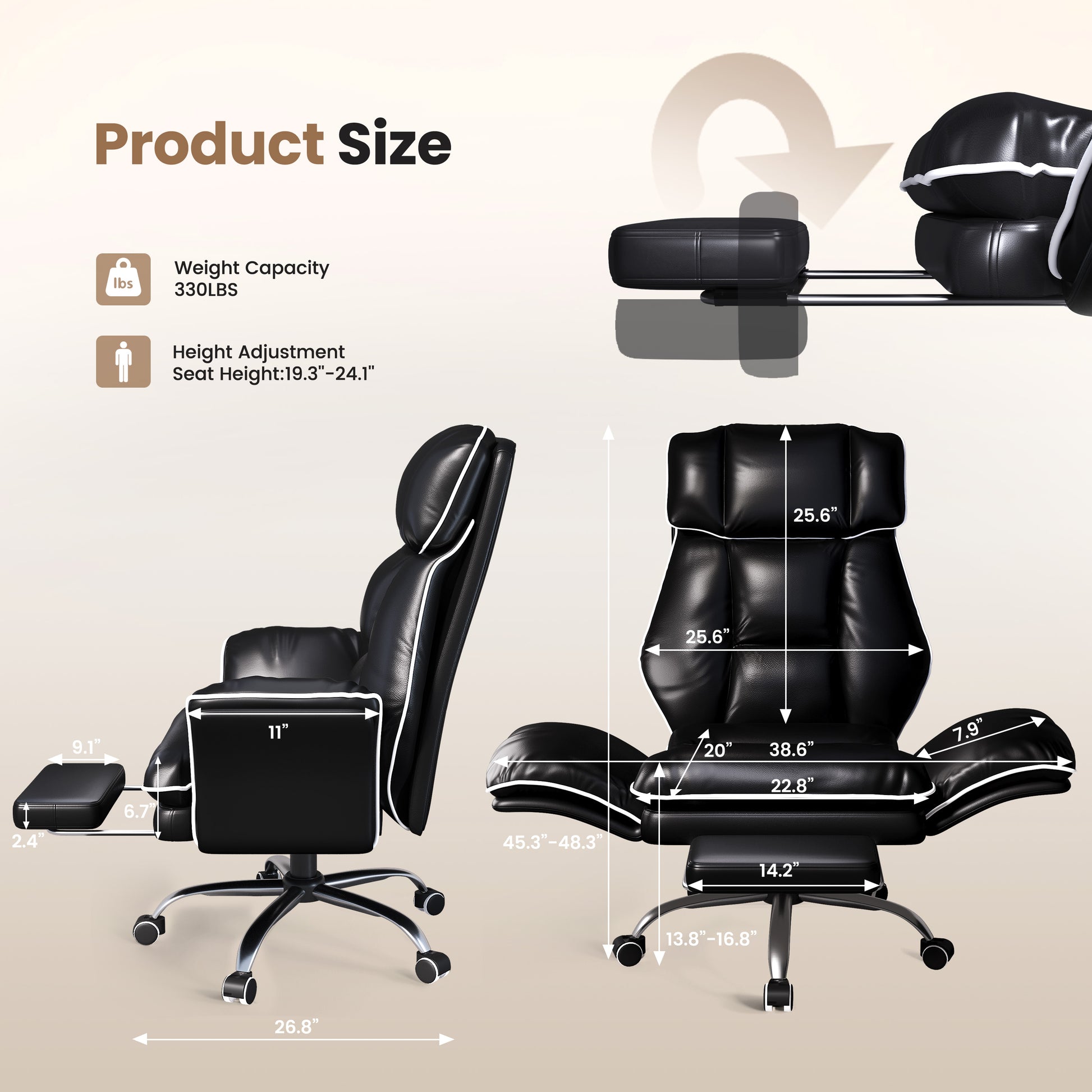 🪑 Unmatched Comfort for Big & Tall Professionals! Experience premium ergonomic support with oversized executive chair. Designed for extended work sessions, this heavy-duty recliner features extra-wide seating (22.8" width) and adjustable high backrest (up to 54" height) to perfectly cradle your spine. The built-in footrest 👣 deploys instantly for zero-gravity relaxation, while breathable PU leather resists stains and overheating. Tilt back 15° with 4-position lock to nap, read, or brainstorm – all atop a 360° silent-roll base that glides on carpets and hard floors. For home offices demanding durability and luxury, this is your throne!