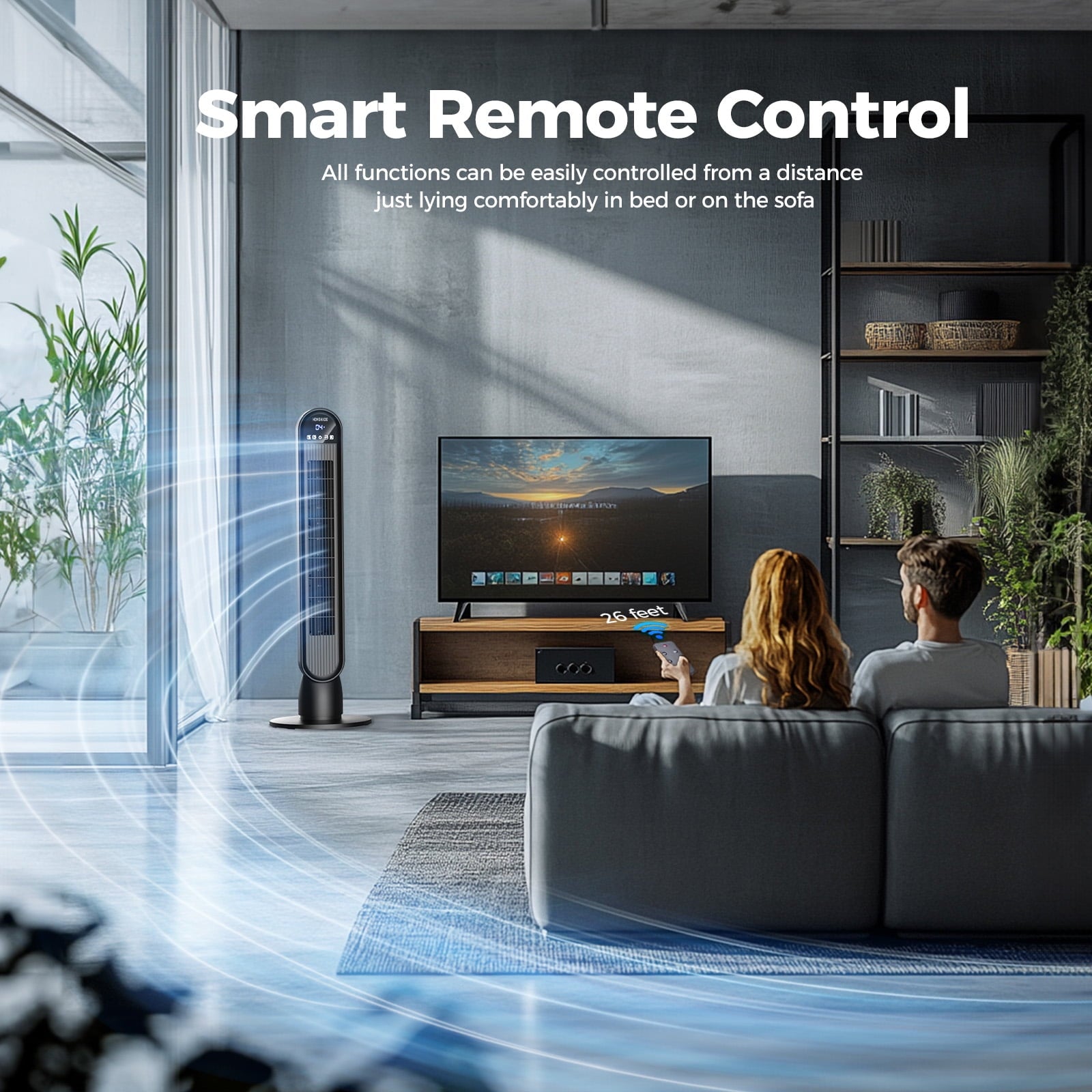 POWERFUL AND ADJUSTABLE AIRFLOW: 45W motor generates powerful airflow with a maximum air speed of 26ft/s. FOUR AIR SPEEDS AND FOUR MODES: Customized cooling for different occasions and preferences. INTELLIGENT FUNCTION: 8-hour timer function and automatic adjustment according to room temperature. EASY TO MOVE AND USE: The hidden handle on the back makes moving the fan effortless. Simple assembly using the supplied base and clear instruction manual ensures easy setup. ROOM TEMPERATURE DISPLAY: The TED screen displays the room temperature (32°F - 99°F) in high definition to keep you informed. WIDE OSCILLATION ANGLE: Extra wide oscillation angle distributes cool air evenly throughout the room to provide total cooling.