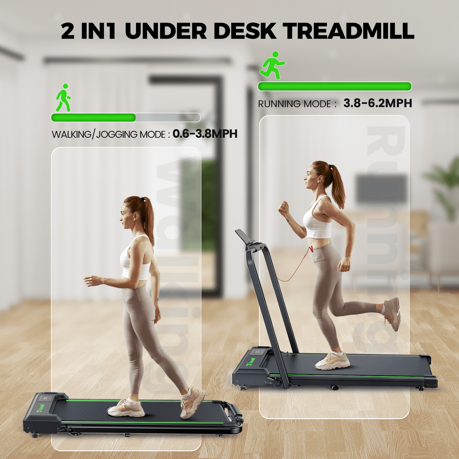 【NEW UPGRADED TREADMILL】The walking pad adopts a unique design, equipped with a stand and handles, with a touch screen function, you can use the mobile phone stand to watch videos or chat with friends, and there is a handle support when using the running mode to increase safety. The treadmill is equipped with a remote control, which is convenient for adjusting the moving speed and stopping immediately. 【PORTABLE TREADMILL 2 IN 1 WITH HANDLEBAR】A combination of a walking pad treadmill and a home folding treadmill. On this 2-in-1 folding treadmill, you can easily switch between running and walking modes. Convenient remote control, which can also be easily adjusted and stored. 【WIDE RUNNING BELT TREADMILL&KENN PROTECTION】Patbrela treadmill walking is equipped with a powerful 2.5HP low-noise motor, 6-layer non-slip running belt with a spacious running area, 8 silicone shock absorbers, 2 soft rubber pads and durable steel frame let you experience comfort and quietness. It can withstand a load of up to 300 pounds. With an advanced frame structure, the running belt is automatically aligned, and the running is more stable, providing effective and safe cushioning for your knees. The treadmill with handles can provide support and safety while you run. The portable walking treadmill has a speed range of 0.6 to 6.2MPH. 【MULTI-FUNCTION DISPLAY】Treadmill for home office has Track time, calories, speed and distance on the LED display, and see your exercise data at a glance. 【EASY TO INSTALL&SMALL STORAGE SPACE】Open the desk treadmill with handles and stand the handles upright, install 1 knob to work, no other complicated operations are required; two transport wheels design, can be easily moved under the bed, sofa and table, and can also be stored vertically.